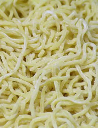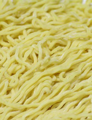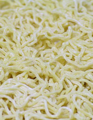 通常ラーメンは小麦粉、水、添加物を混合してミキシングし、圧延、切り出した物ですが、弊社ではこの作業工程に改善を加え、なめらかな食感と茹のびしにくい麺にしました。一般的には小麦粉と水は完全に混ざり合っていると考えられてきましたが、麺の断面を顕微鏡で見ると、気泡と遊離水が無数にあることがわかりました。気泡については、一般的に麺を茹でる際に、麺はすぐにお湯の表面に浮き上がってきますが、これは面の中にある気泡が熱により膨張して浮力が付く為です。この気泡の中に徐々に水分が入り込み麺が延びた状態となります。麺を丼にスープと一緒に入れたままにしておきますと、やがてスープは麺が吸ってしまう事は経験していると思いますが、弊社の麺はこの気泡が少ない為、スープはほとんど吸いません。これが麺が延びにくい証拠です。